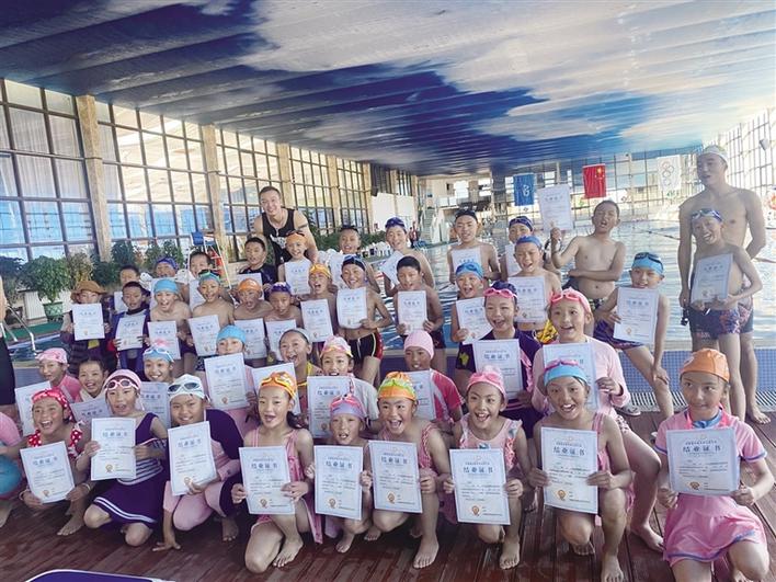 一批小學生完成遊泳培訓拿到證書(shu) 。