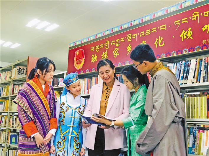 共青團西藏自治區委員會(hui) 副書(shu) 記格桑卓瑪(中),在武漢西藏中學設立的“觸摸家鄉(xiang) 變化·傾(qing) 聽黨(dang) 的聲音”主題書(shu) 刊欄處向學生們(men) 介紹相關(guan) 書(shu) 籍。