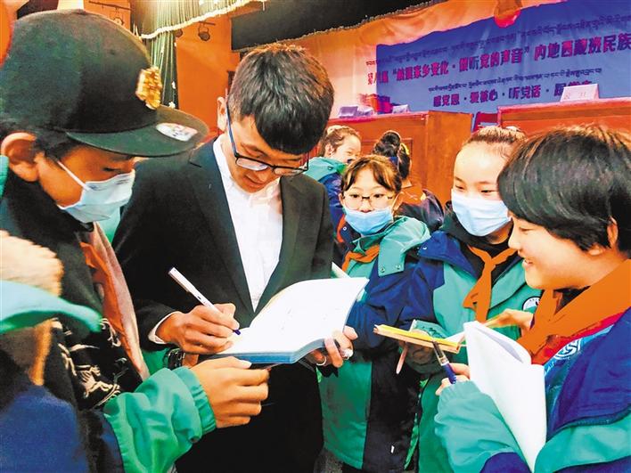 宣講活動過程中,共青團西藏自治區委員會(hui) 副書(shu) 記格桑卓瑪、西藏青年報社副社長洛桑頓珠給6所學校內(nei) 地西藏班的學生們(men) 贈送了《西藏青年報》《西藏青年》等刊物和書(shu) 籍。格桑卓瑪語重心長地囑咐孩子們(men) :“作為(wei) 新時代的新青年,要時刻牢記時代賦予的新使命,要用新時代的標尺審視自己,用科學文化武裝自己,淡化宗教消極影響,在新征程的熔爐中鍛造自己,努力使自己成為(wei) 堪當民族複興(xing) 大任的新青年,在全麵建設社會(hui) 主義(yi) 現代化國家新征程中貢獻自己的青春力量,做神聖國土的守護者、幸福家園的建設者,在青春的閃光中踐行‘感黨(dang) 恩、愛核心、聽黨(dang) 話、跟黨(dang) 走’的家國情懷。”