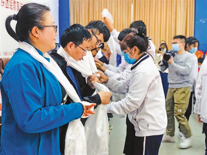 內(nei) 地西藏班師生為(wei) 宣講組敬獻哈達。