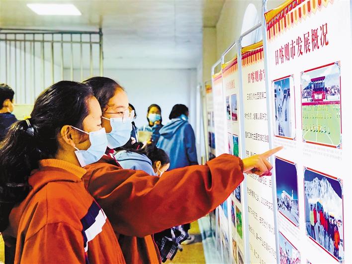 宣講組一行通過圖片和文字資料,向內(nei) 地西藏班的學子們(men) 展示了西藏翻天覆地的變化及各項事業(ye) 取得的成就。圖為(wei) 內(nei) 地西藏班學生觀看圖片和文字展。
