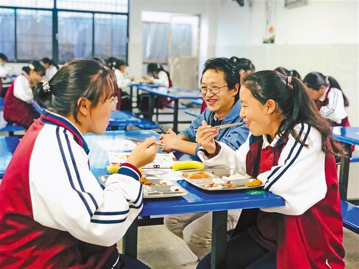 西藏青年報社副社長洛桑頓珠(右二)在珠海四中學校食堂與(yu) 內(nei) 地西藏班學生進行交談。