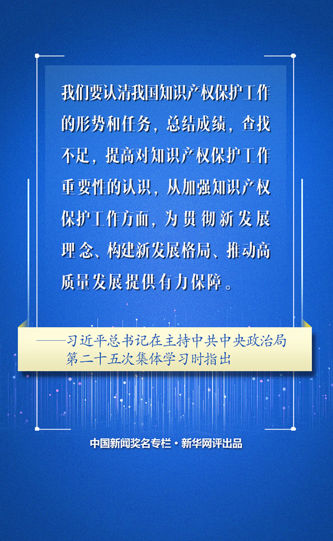 近日,中共中央政治局就加強我國知識產(chan) 權保護工作舉(ju) 行第二十五次集體(ti) 學習(xi) ,習(xi) 近平總書(shu) 記在主持學習(xi) 時發表重要講話,回顧總結我國知識產(chan) 權保護工作取得的曆史性成就,深刻闡述知識產(chan) 權保護工作的重要性,對全麵加強知識產(chan) 權保護工作提供了明確思路和行動指南。