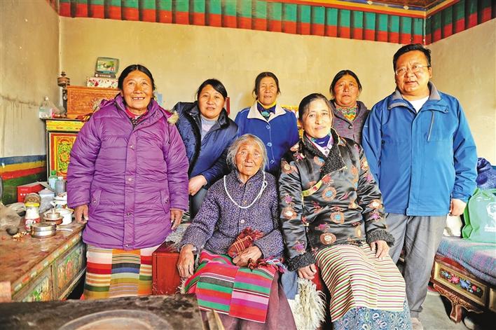 圖為(wei) 烏(wu) 巴·平措南加的妻子次仁卓嘎和6個(ge) 子女合影,左二為(wei) 格桑玉珍,右一為(wei) 曲阿。記者 溫凱 洛桑旦增 達珍 攝