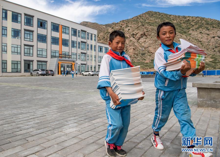 在山南市貢嘎縣森布日幸福家園九年一貫製學校,剛開學的孩子們(men) 搬新書(shu) (8月24日攝)。新華社記者 孫非 攝