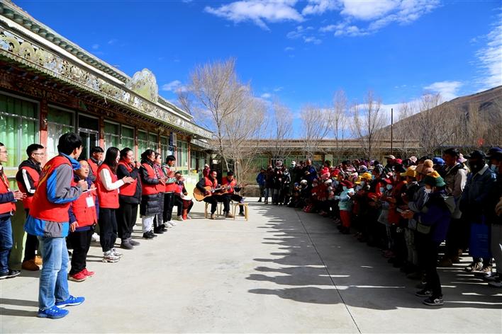 圖為(wei) 誌願者和孩子們(men) 一起合唱歌曲《讓世界充滿愛》。 倫(lun) 珠澤仁 洛桑 攝
