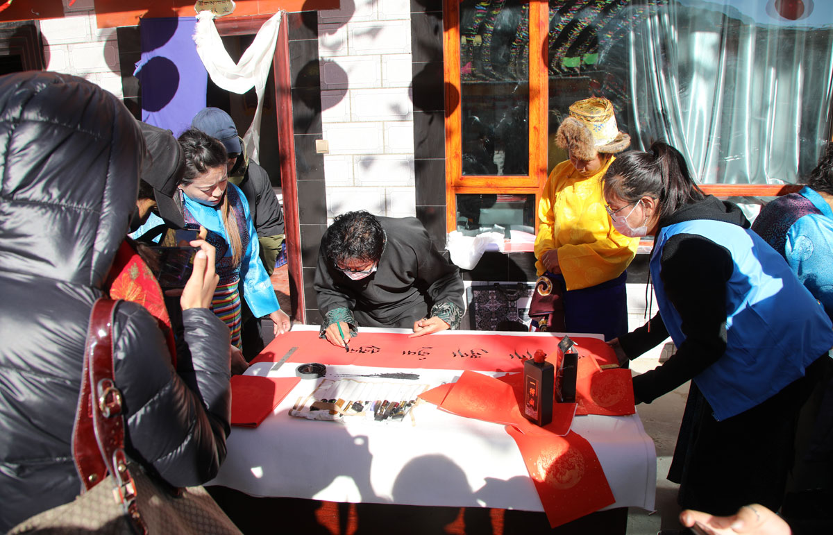 西藏自治區書(shu) 協副主席、拉薩市書(shu) 協副主席南傑旺紮說:“值此新春佳節和藏曆新年來臨(lin) 之際,拉薩市文聯書(shu) 法家協會(hui) 組織了三位老師來到吉蘇村開展送書(shu) 法活動,一是宣傳(chuan) 黨(dang) 的好政策,二是雙節臨(lin) 近給基層幹部群眾(zhong) 送上節日的祝福。”