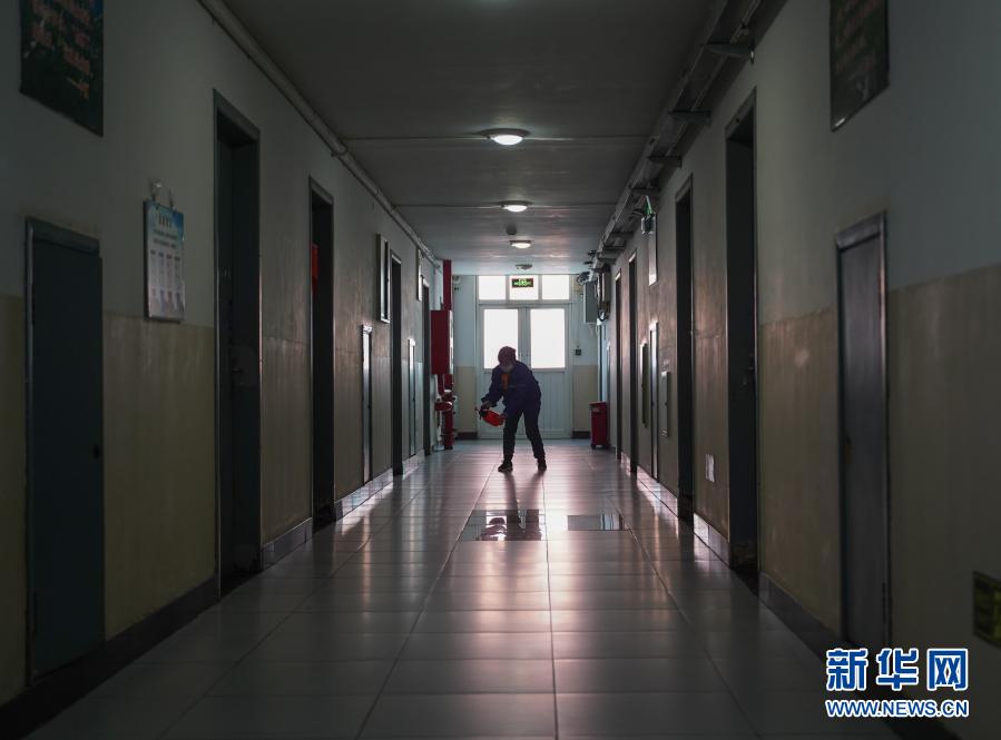2月8日,工作人員在北京交通大學22號公寓樓道內(nei) 進行消殺。新華社記者 張浩波 攝