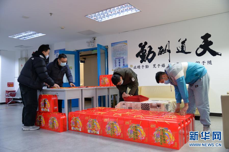2月9日,北京交通大學輔導員和學生誌願者在整理為(wei) 留校學生準備的新春禮包。新華社記者 徐欽 攝