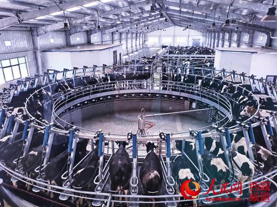 下午5點,正是擠奶時間。養(yang) 殖場早就拋棄傳(chuan) 統人工擠奶,取而代之的是現代化操作車間。全自動轉盤式擠奶設備,運用全自動糞汙處理係統對奶牛的糞尿進行減量化、無害化、資源化處理,形成了“奶牛養(yang) 殖—沼液還田—飼草種植”的綠色循環養(yang) 殖模式。