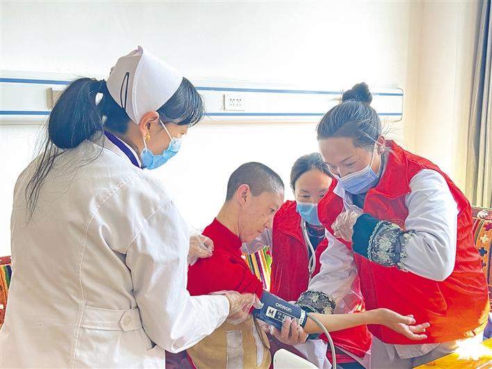 圖為(wei) 誌願者們(men) 協助醫生,給那曲市殘疾人聯合會(hui) 殘疾人康複托養(yang) 中心的患者測量血壓。萬(wan) 靖 攝