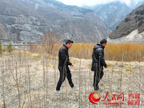 次仁多布傑(左)檢查苗圃。李海霞 攝