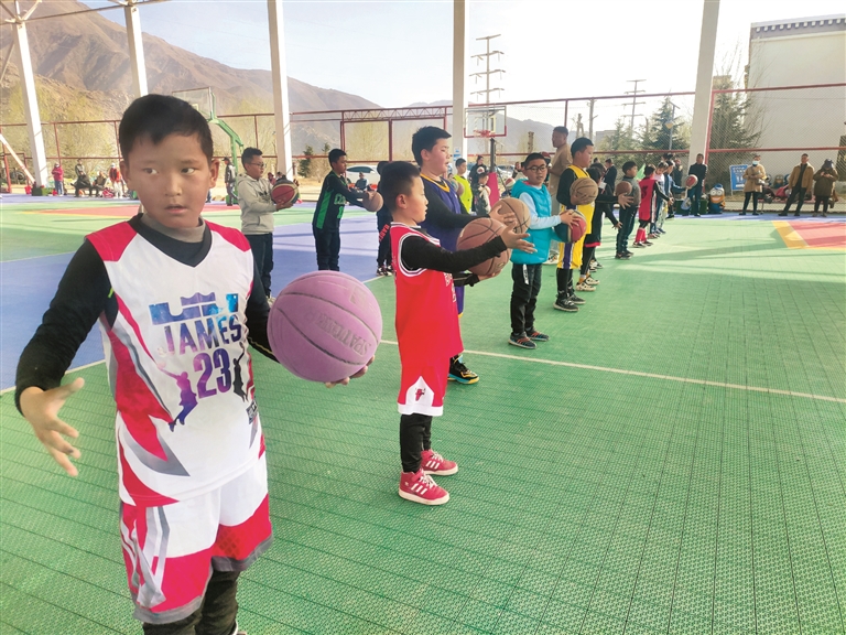 圖為(wei) 籃球興(xing) 趣班小學員們(men) 在做準備運動。 拉薩融媒記者 趙耀鐵攝