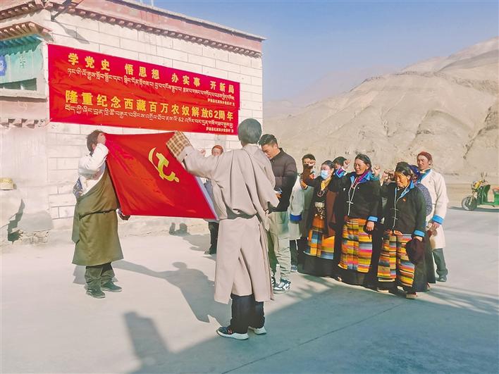 薩迦縣紮西崗鄉(xiang) 查務村農(nong) 牧民黨(dang) 員開展重溫入黨(dang) 誓詞活動。