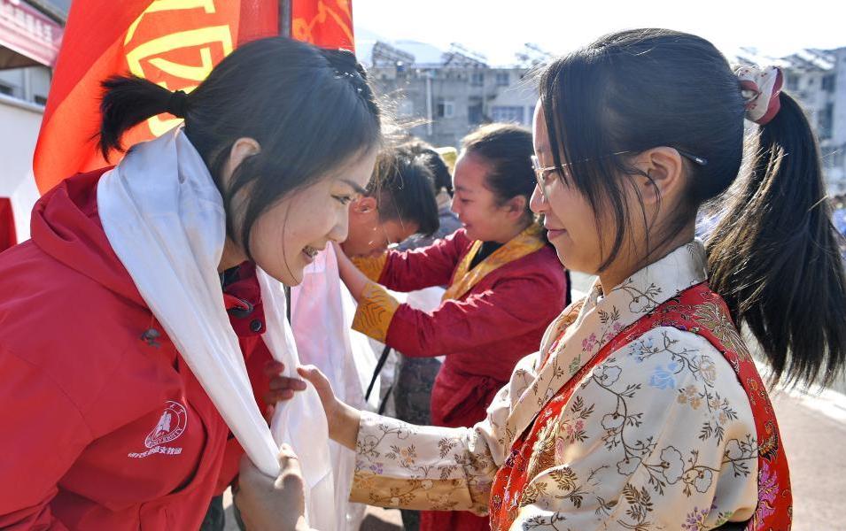 3月30日,米林縣中學學生在“U+校餐計劃”捐贈儀(yi) 式上表演節目。新華社記者 孫瑞博 攝