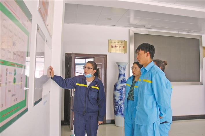 圖為(wei) 鐵路接卸油庫青年員工索娜曲珍為(wei) 新入職員工講解油庫工藝流程。李一蕾 唐啟勝 攝