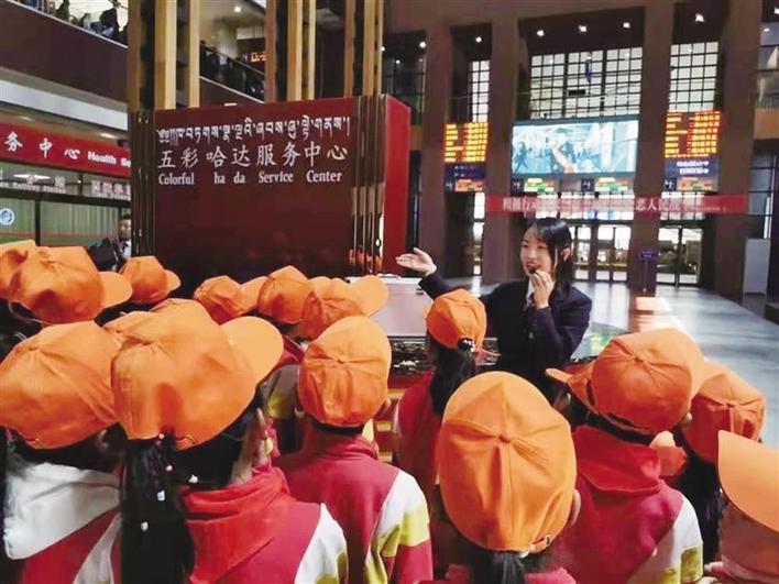 拉薩火車站工作人員正在給參觀人員進行講解。記者 張雪芳 攝