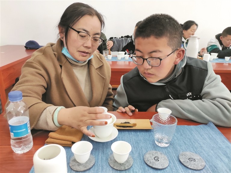 圖為(wei) 學生和家長一起學習(xi) 、體(ti) 驗茶藝禮儀(yi) 知識。拉薩融媒記者 趙耀鐵攝
