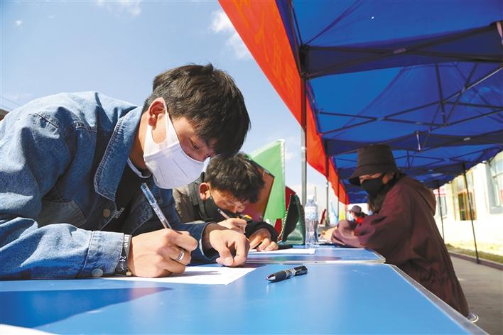 圖為(wei) 瓊結籍大學生在招聘會(hui) 現場填寫(xie) 簡曆。倫(lun) 珠澤仁 記者 洛桑 攝