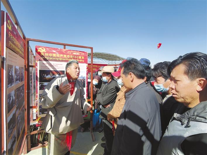 圖為(wei) 在桑珠孜區甲措雄鄉(xiang) 文化廣場,宣講員結合展板圖文內(nei) 容開展黨(dang) 史學習(xi) 教育宣講。汪純 攝