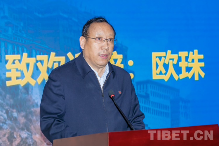 圖為(wei) 西藏民族大學黨(dang) 委書(shu) 記歐珠致歡迎辭