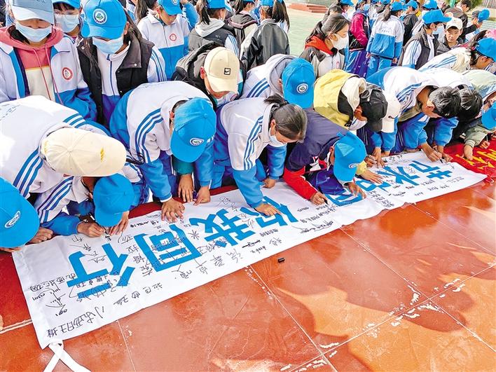 圖為(wei) 學生們(men) 在條幅上簽名,許下節水愛水的承諾。錢加典 王珊 攝