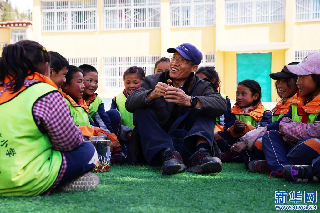 5月1日,在西藏昌都市類烏(wu) 齊縣伊日鄉(xiang) 小學,李純民(中)和學生們(men) 交流。新華社記者 黃臻 攝