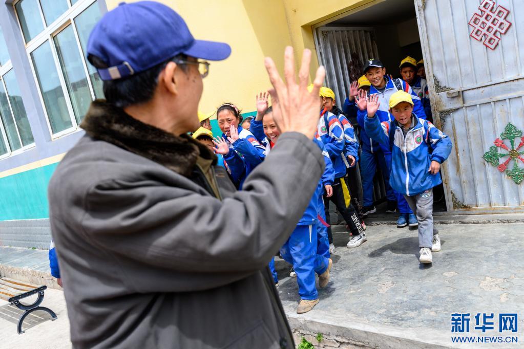 5月4日,在西藏昌都市類烏(wu) 齊縣長毛嶺鄉(xiang) 第一小學,學生們(men) 向李純民道別。新華社記者 劉金海 攝