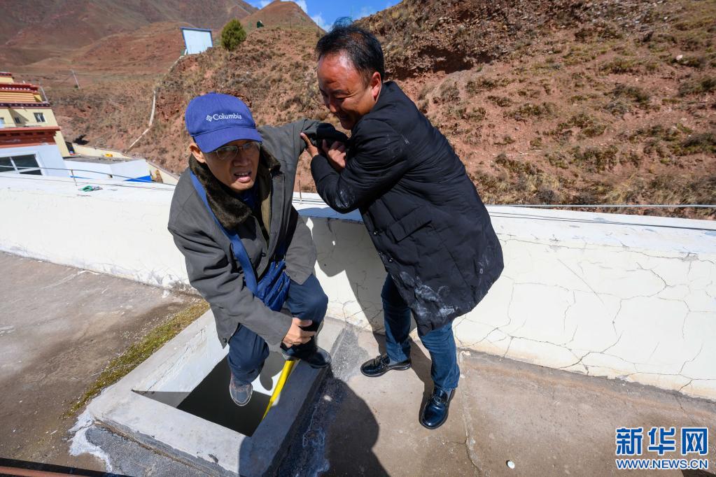 5月3日,在西藏昌都市類烏(wu) 齊縣吉多鄉(xiang) 小學,李純民(左)在吉多鄉(xiang) 小學校長鄧增群培的幫助下,爬上學生食堂樓頂,監督太陽能熱水器的維修工作。新華社記者 劉金海 攝