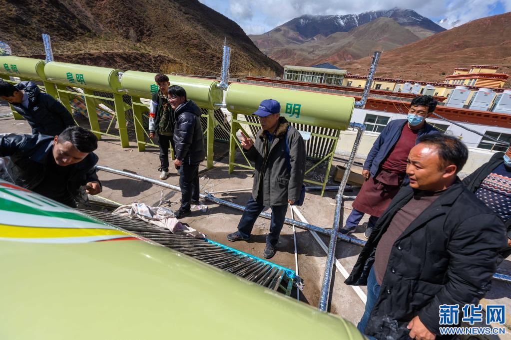 5月3日,在西藏昌都市類烏(wu) 齊縣吉多鄉(xiang) 小學,李純民(中)在吉多鄉(xiang) 小學學生食堂樓頂,監督太陽能熱水器的維修工作。2014年至2020年,“齊興(xing) ”助學獎勵基金通過多種方式,籌集資金200多萬(wan) ,為(wei) 類烏(wu) 齊縣12所鄉(xiang) 鎮小學安裝太陽能熱水器和多媒體(ti) 教學一體(ti) 機。新華社記者 劉金海 攝