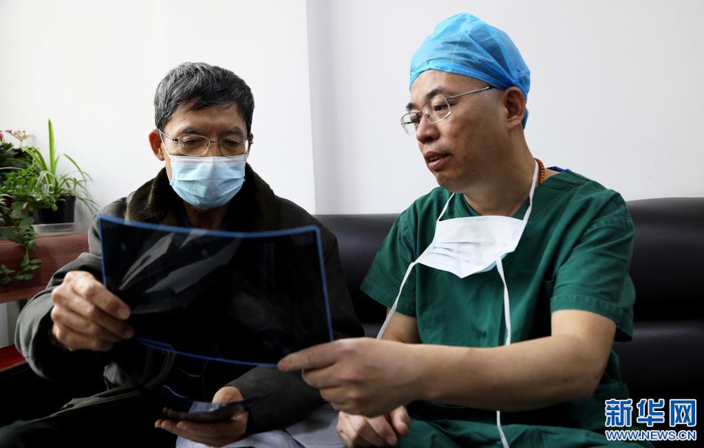 5月12日,李純民(左)與(yu) 西藏昌都市藏醫院骨科天津援藏的李明新主任查看右腳殘疾女童紮西措姆的X光片。新華社記者 普布紮西 攝