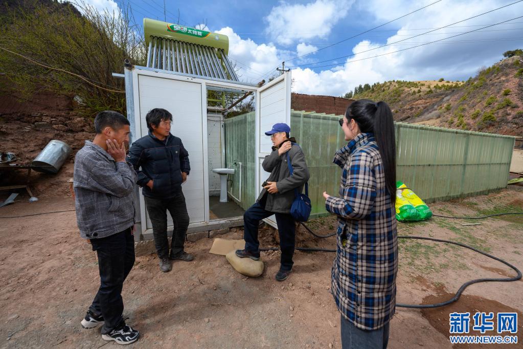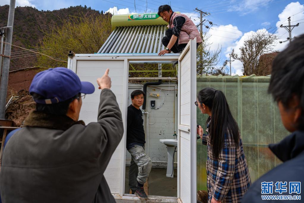 5月2日,李純民趕到西藏昌都市類烏(wu) 齊縣濱達鄉(xiang) 濱達村,為(wei) 當地村民向巴巴登協調太陽能熱水器的安裝調試工作。這是李純民(右二)通過濱達鄉(xiang) 小學老師索朗卓瑪(右一)作藏語翻譯,就熱水淋浴室與(yu) 水衝(chong) 廁整體(ti) 改造計劃給向巴巴登(左二)提出建議。新華社記者 劉金海 攝