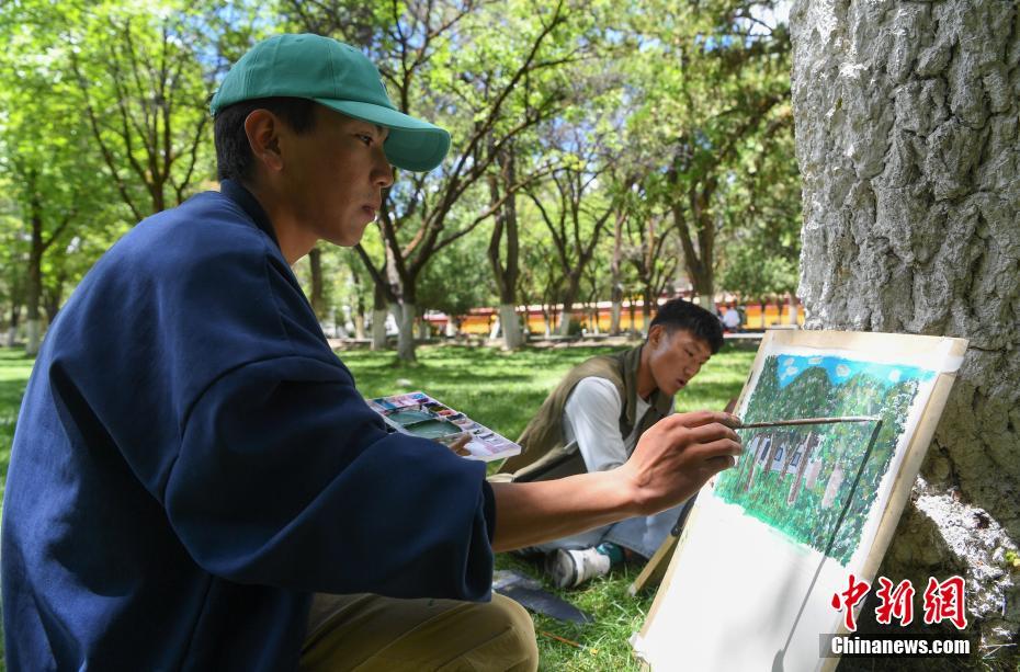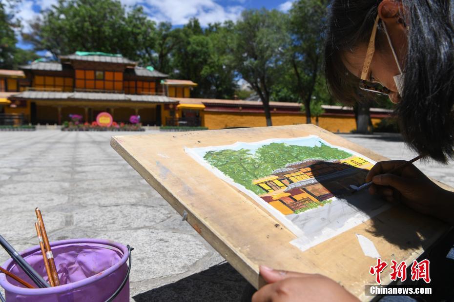 7月8日,西藏大學建築係學生前往西藏自治區拉薩市城關(guan) 區羅布林卡進行建築美術實習(xi) 。在7天的實習(xi) 中,學生們(men) 將在哲蚌寺、色拉寺等地,把西藏民族特色建築、風景一幅幅手繪在紙上。圖為(wei) 西藏大學建築係學生手繪羅布林卡風景。 中新社記者 貢嘎來鬆 攝