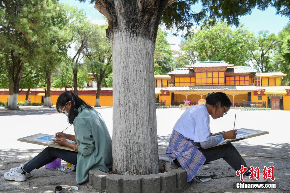 圖為(wei) 西藏大學建築係學生正在手繪羅布林卡內(nei) 的建築。 中新社記者 貢嘎來鬆 攝