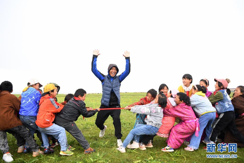 7月14日,河曲馬場小學老師道布旦(中)在草原上組織孩子們(men) 拔河。新華社記者 陳斌 攝