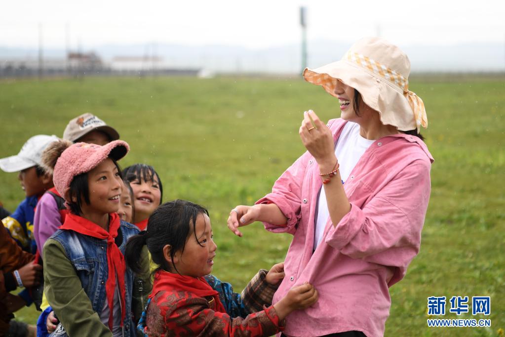 7月14日,河曲馬場小學老師餘(yu) 妙妍(右一)在草原上和孩子們(men) 做遊戲。新華社記者 陳斌 攝