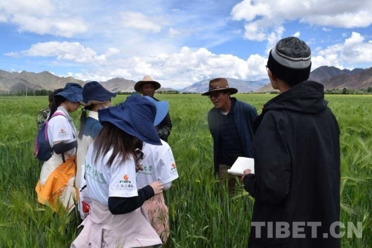 圖為(wei) 中國農(nong) 業(ye) 大學人文科考隊在青稞田裏了解情況
