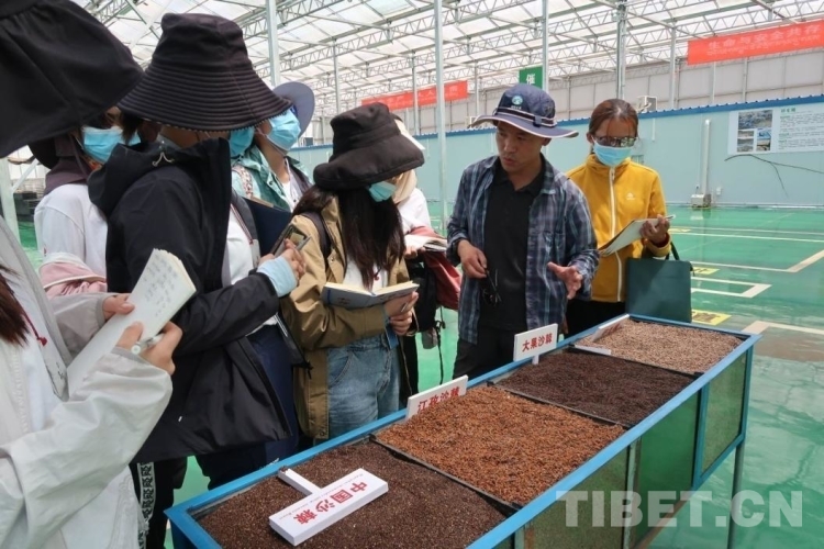 圖為(wei) 綠亞(ya) 生態的工作人員給同學們(men) 講解沙棘種子的選育