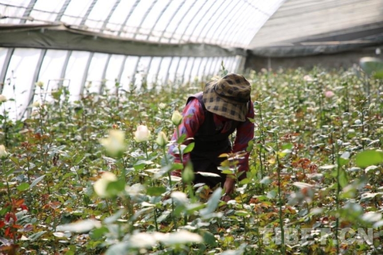 圖為(wei) 工人正在玫瑰大棚內(nei) 對植株修整除草