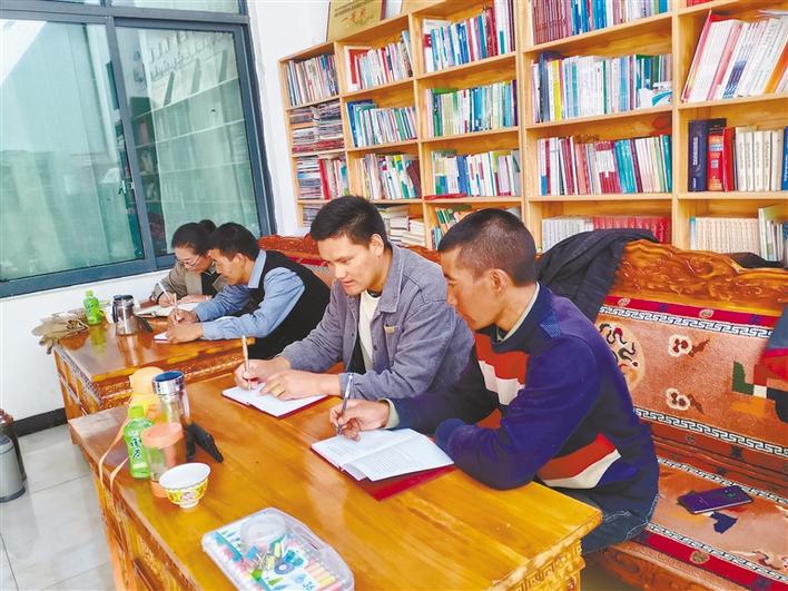 圖為(wei) 薩迦縣木拉鄉(xiang) 基層工作者通過手機參與(yu) 線上“微講堂”培訓班學習(xi) 。記者 汪純 攝
