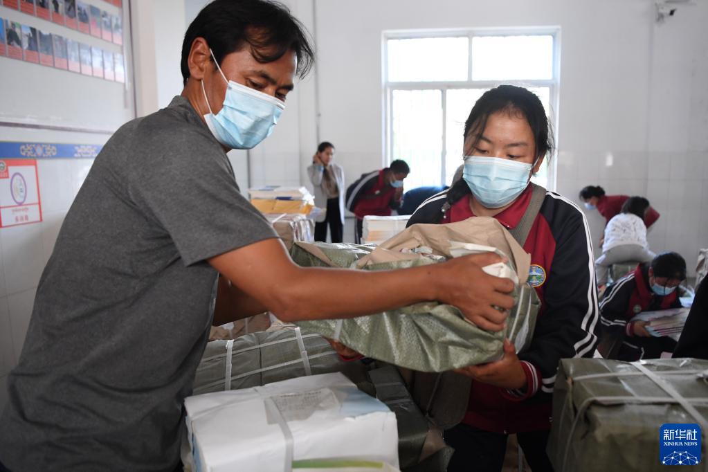 碌曲縣藏族中學的老師給學生分發新學期教材(8月30日攝)。新華社記者 杜哲宇 攝