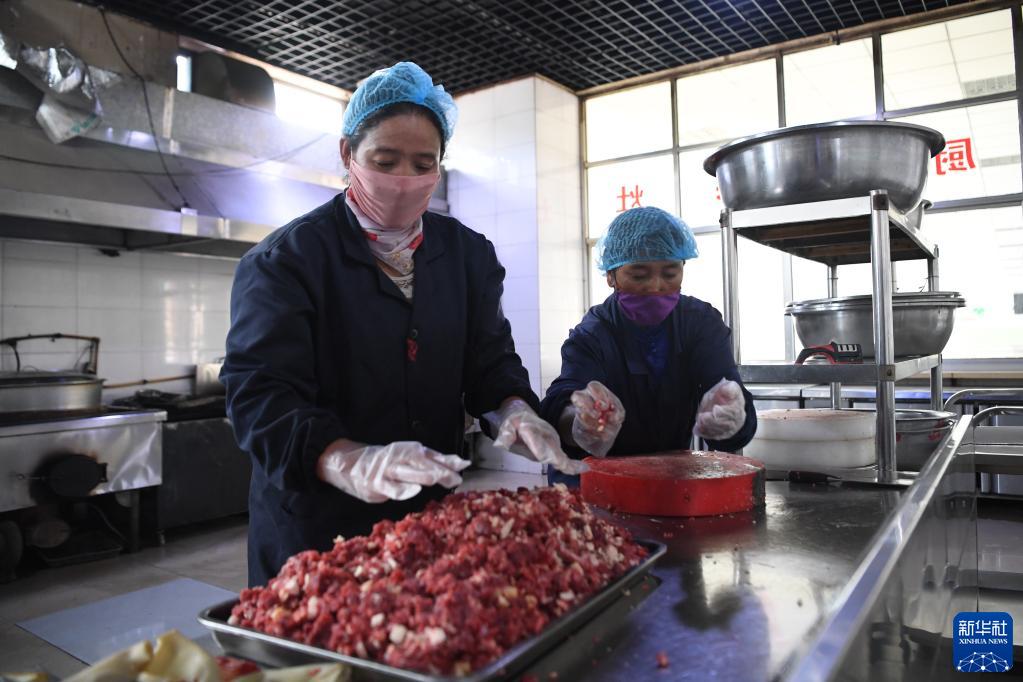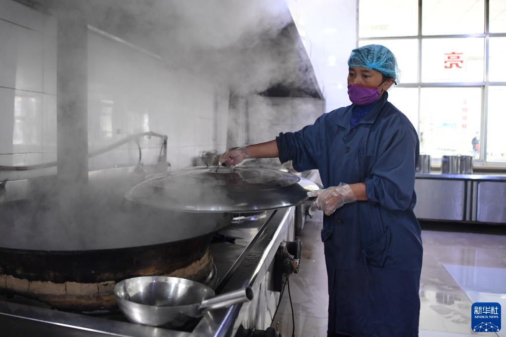 碌曲縣藏族中學學生食堂的工作人員在給學生準備晚飯(8月30日攝)。新華社記者 杜哲宇 攝