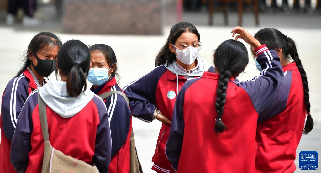碌曲縣藏族中學的幾名高二學生在校園裏交流(8月30日攝)。新華社記者 陳斌 攝