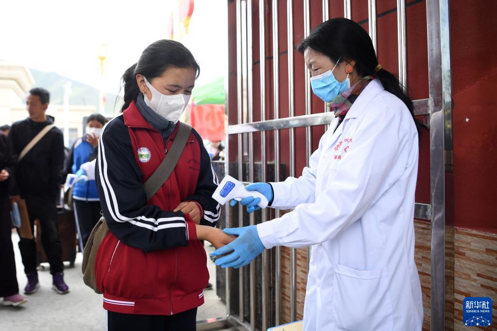 碌曲縣藏族中學學生進入校園時測量體(ti) 溫(8月30日攝)。新華社記者 杜哲宇 攝