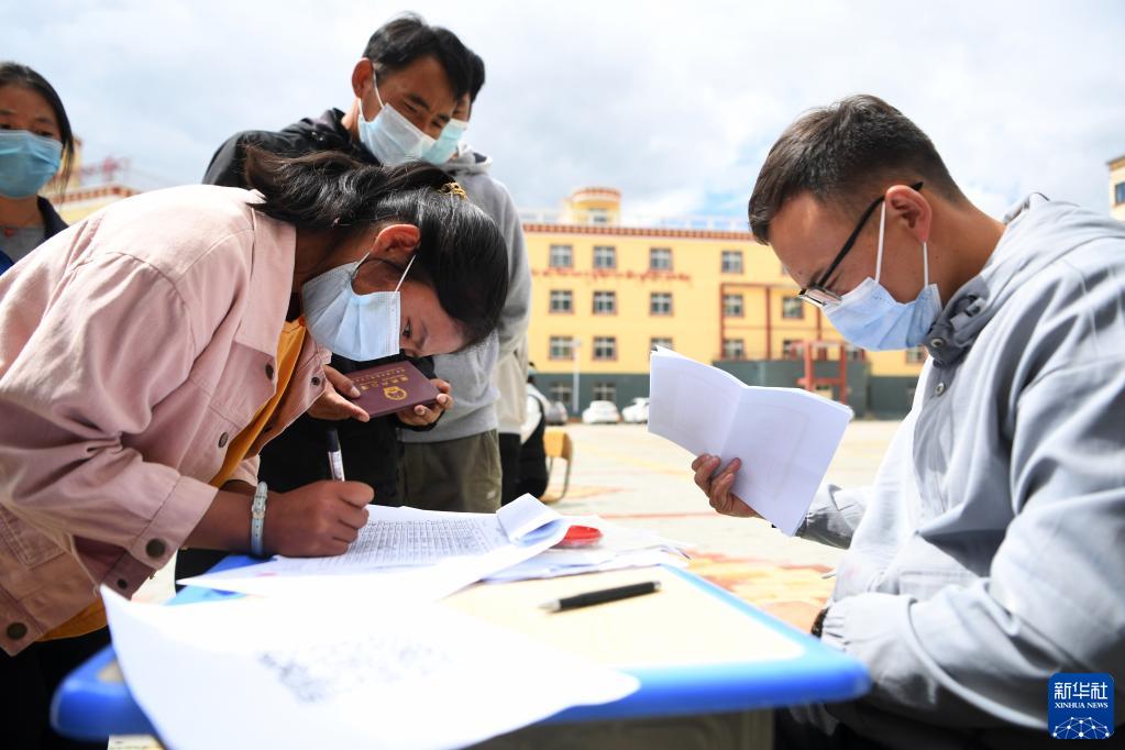 碌曲縣藏族中學高一新生填寫(xie) 報到信息(8月30日攝)。新華社記者 杜哲宇 攝
