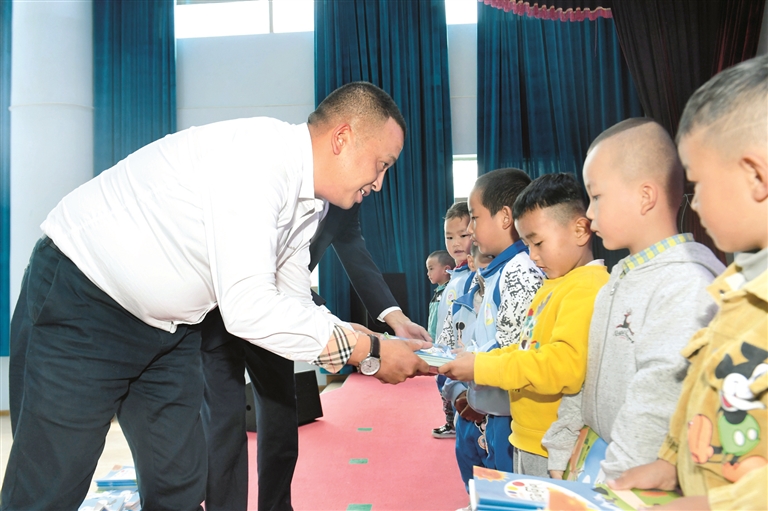 圖為(wei) 尼瑪次仁將圖書(shu) 送到幼兒(er) 手中。拉薩融媒記者 巴桑次仁攝