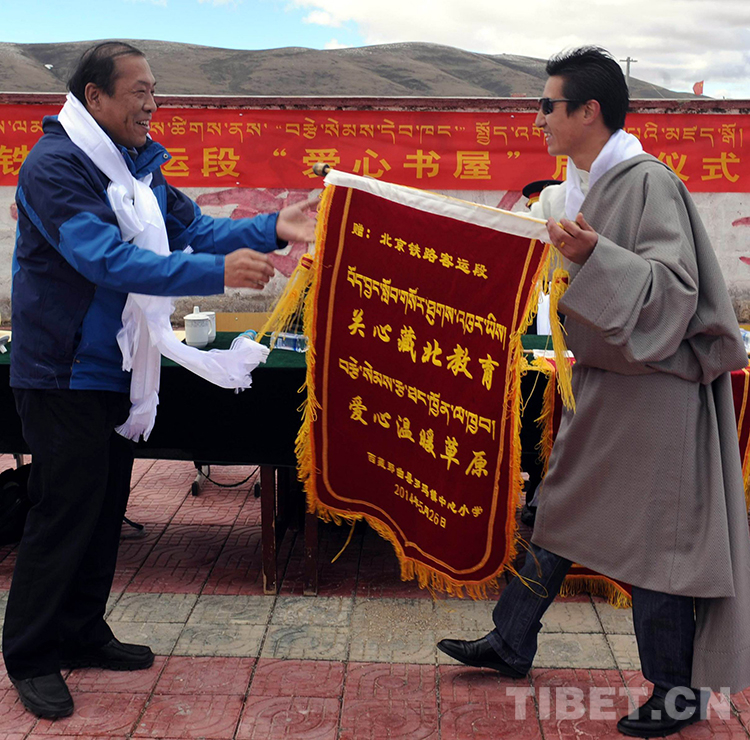 這是西藏那曲地區那曲縣(現那曲市色尼區)羅瑪鎮中心小學校長拉巴格桑(右)代表學校向北京鐵路客運段代表王博軒(左)贈送錦旗(唐召明2014年5月29日攝)