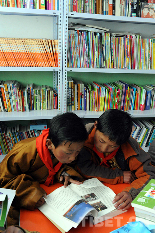 這是西藏那曲地區那曲縣(現那曲市色尼區)羅瑪鎮中心小學學生在新建的“愛心書(shu) 屋”快樂(le) 地讀書(shu) (唐召明2014年5月29日攝)