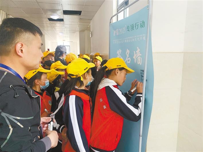 學生在“護苗2021”專(zhuan) 項行動簽名牆上簽名。記者 張宇 攝