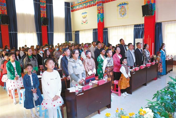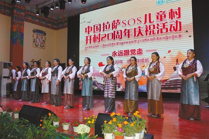 在中國拉薩SOS兒(er) 童村開村20周年慶祝活動上,SOS村全體(ti) 幹部職工和孩子們(men) 共唱國歌。